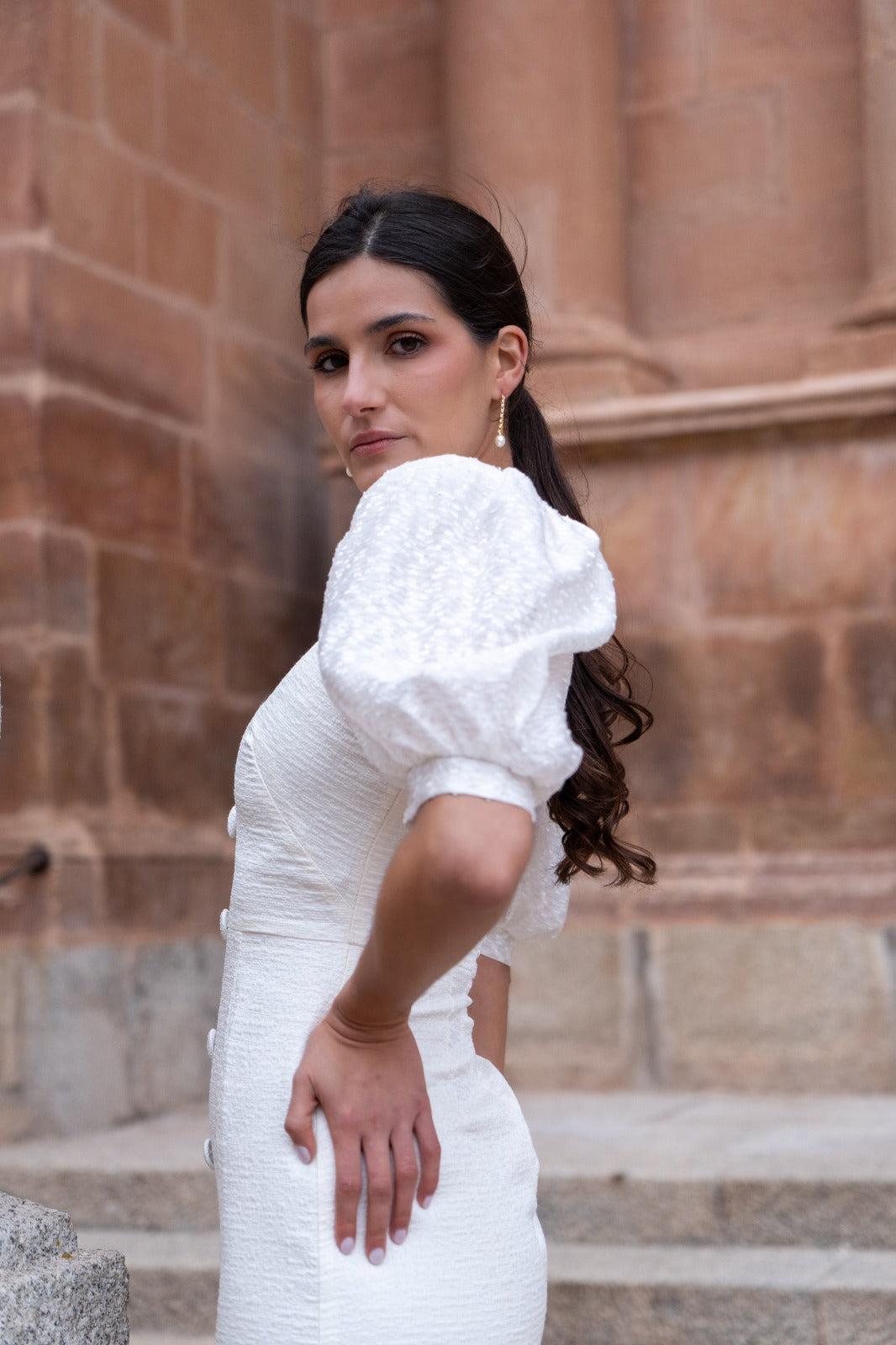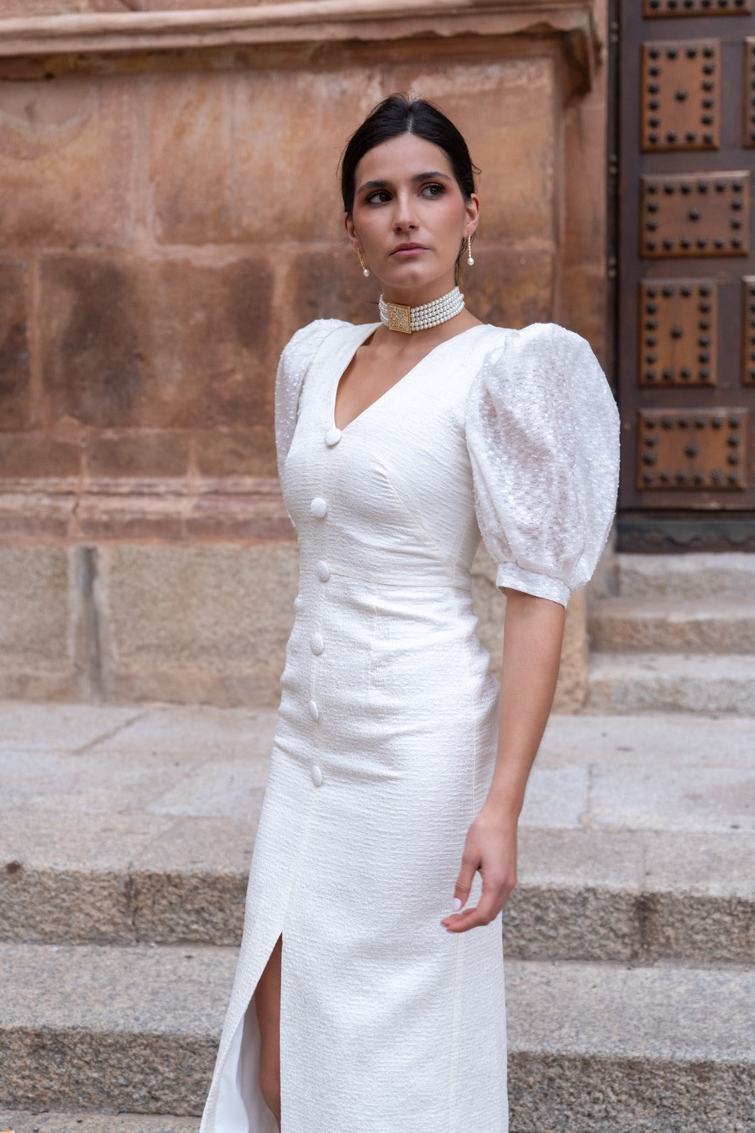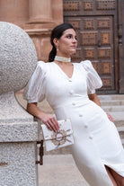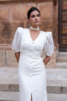 Vestido midi, escote en forma de V, manga corta abullonada con distinto tejido, detalle botones delanteros (no se abren), abertura delantera. En color beige.