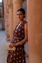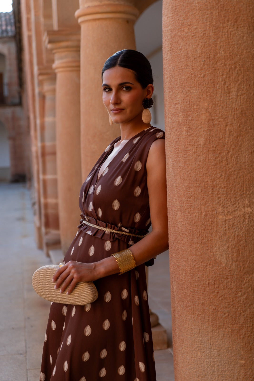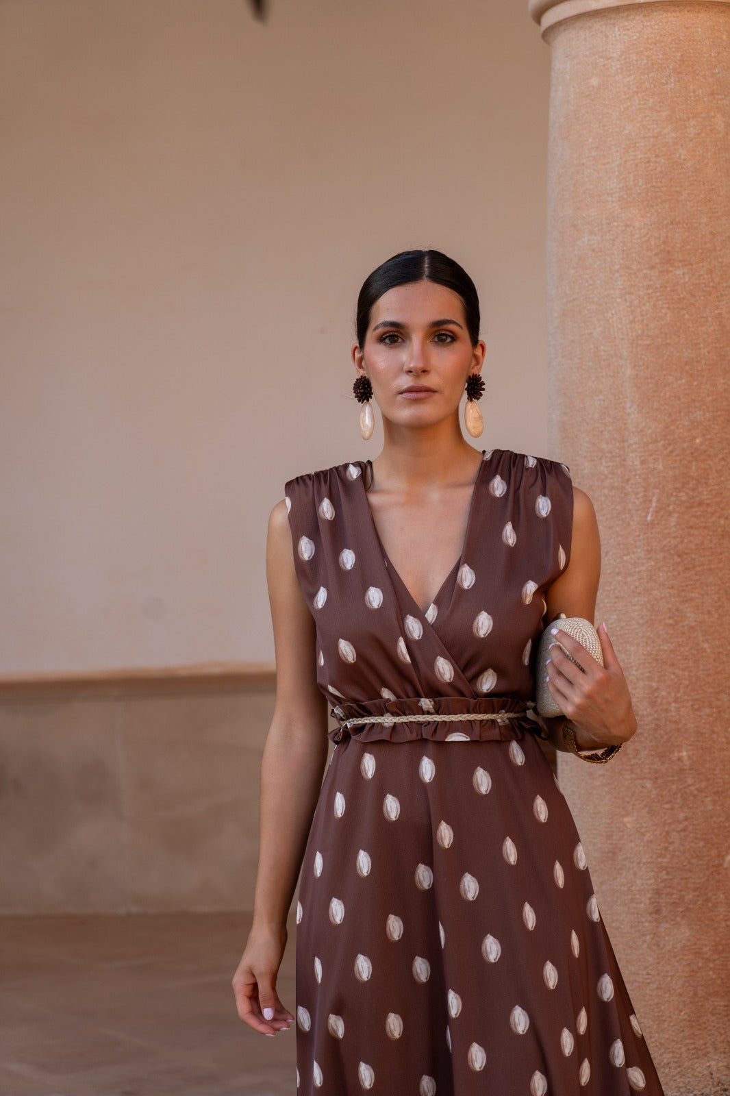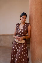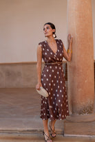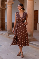 Vestido midi, escore cruzado, sin mangas, corte en cintura, con cinturón del mismo tejido, fluido. En color marrón con lunares.
