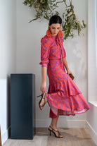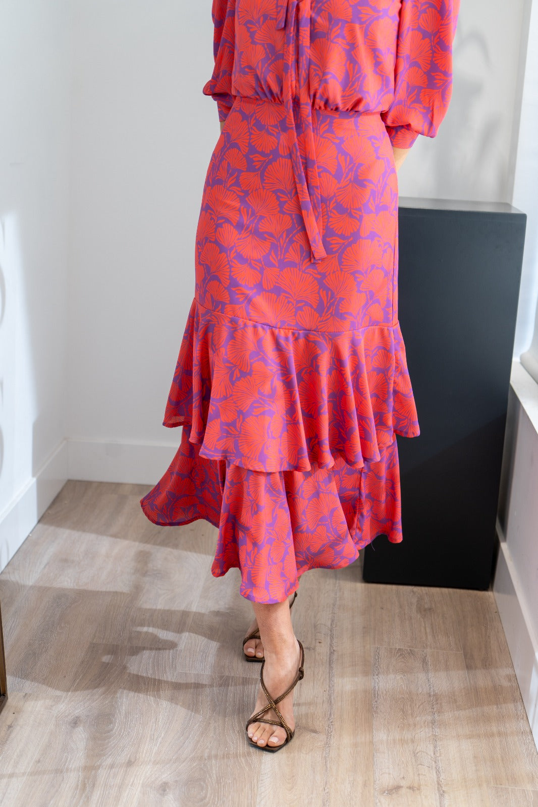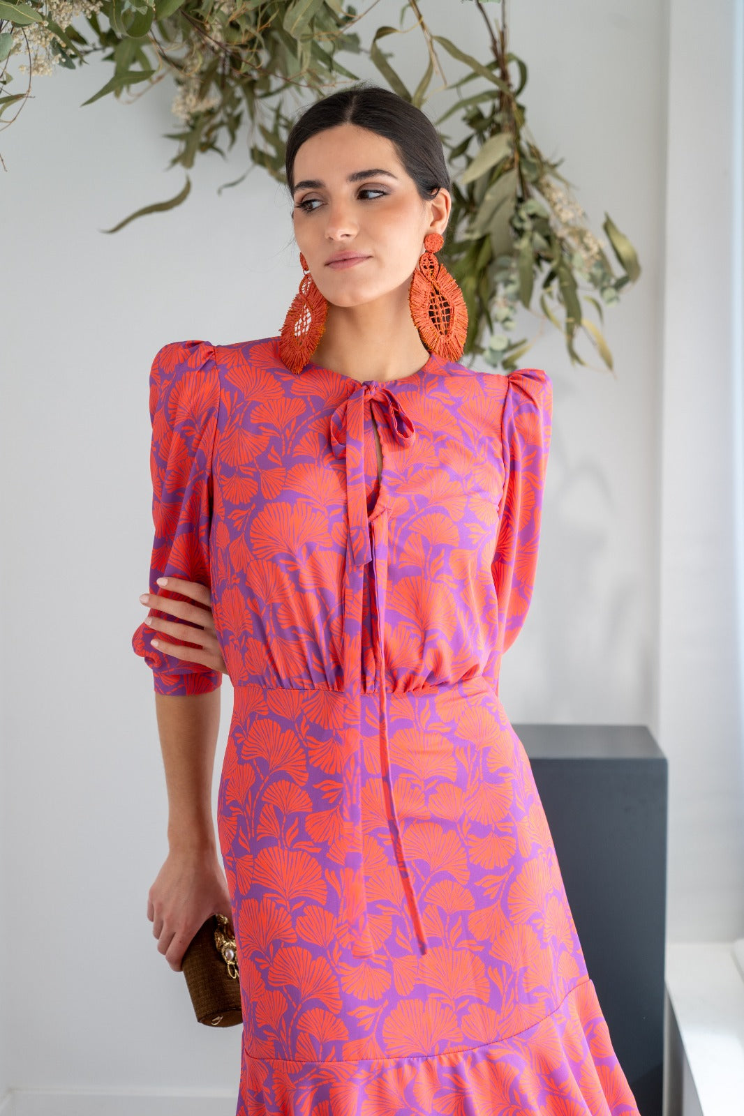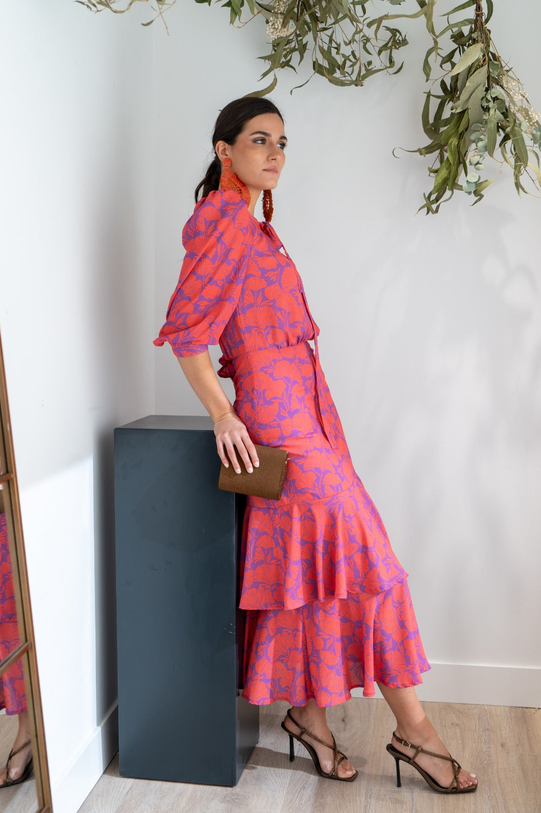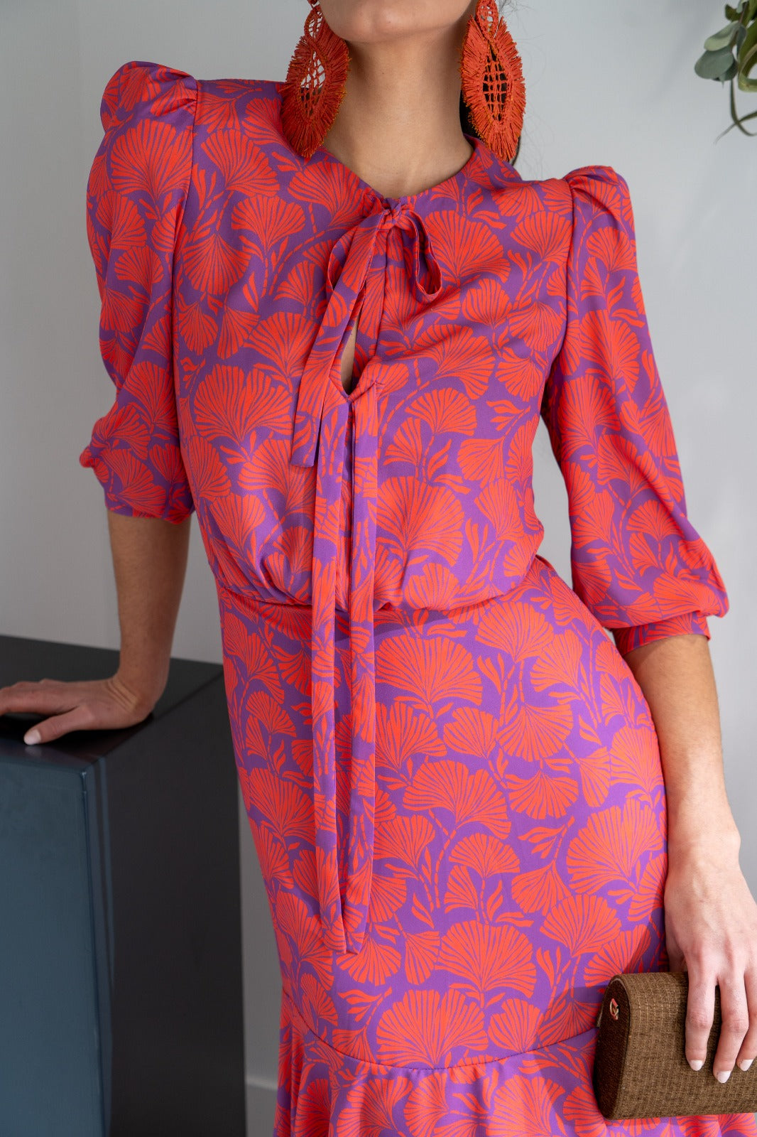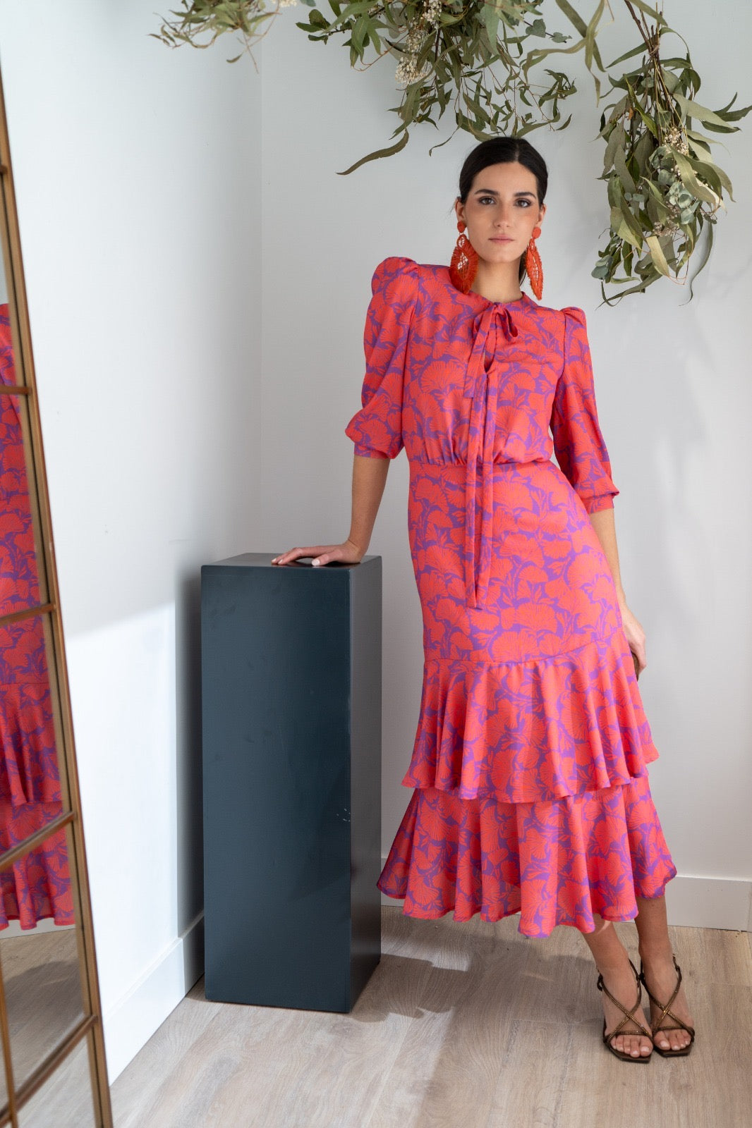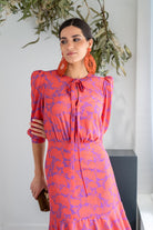 Vestido midi, escote redondo con dos lazos anudados, manga francesa con puño, corte en cintura y volantes abajo. En estampado morado y caldera.