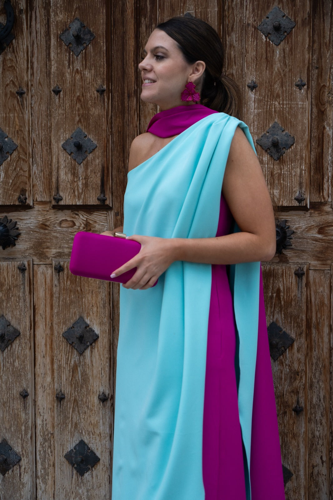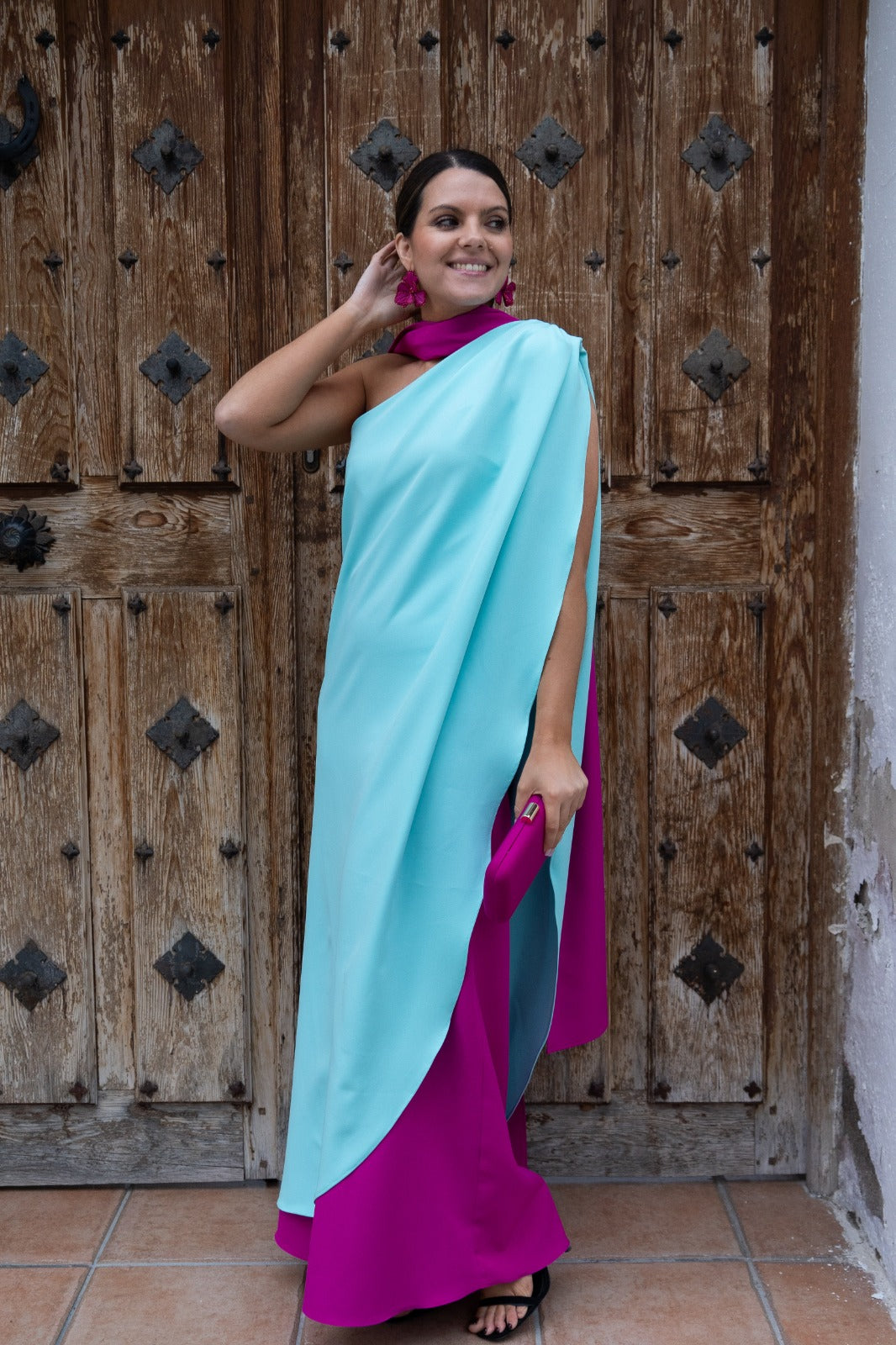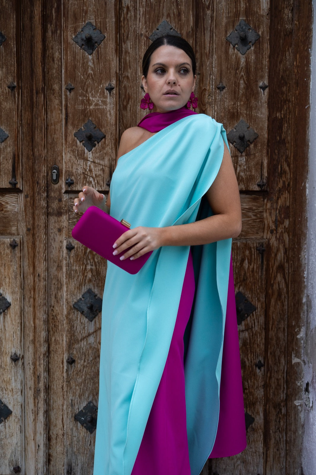 Vestido longo e assimétrico, fúcsia na barra, capa verde-água por cima e laço no pescoço. Bicolor rosa e verde.