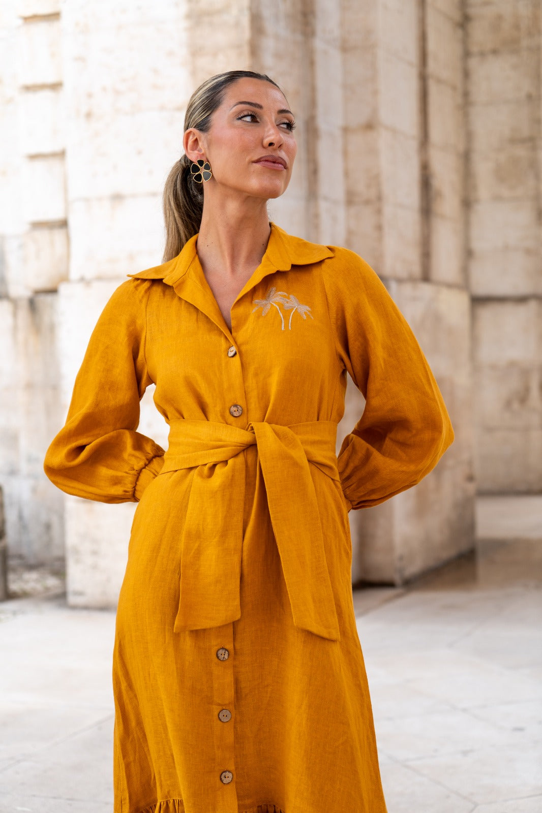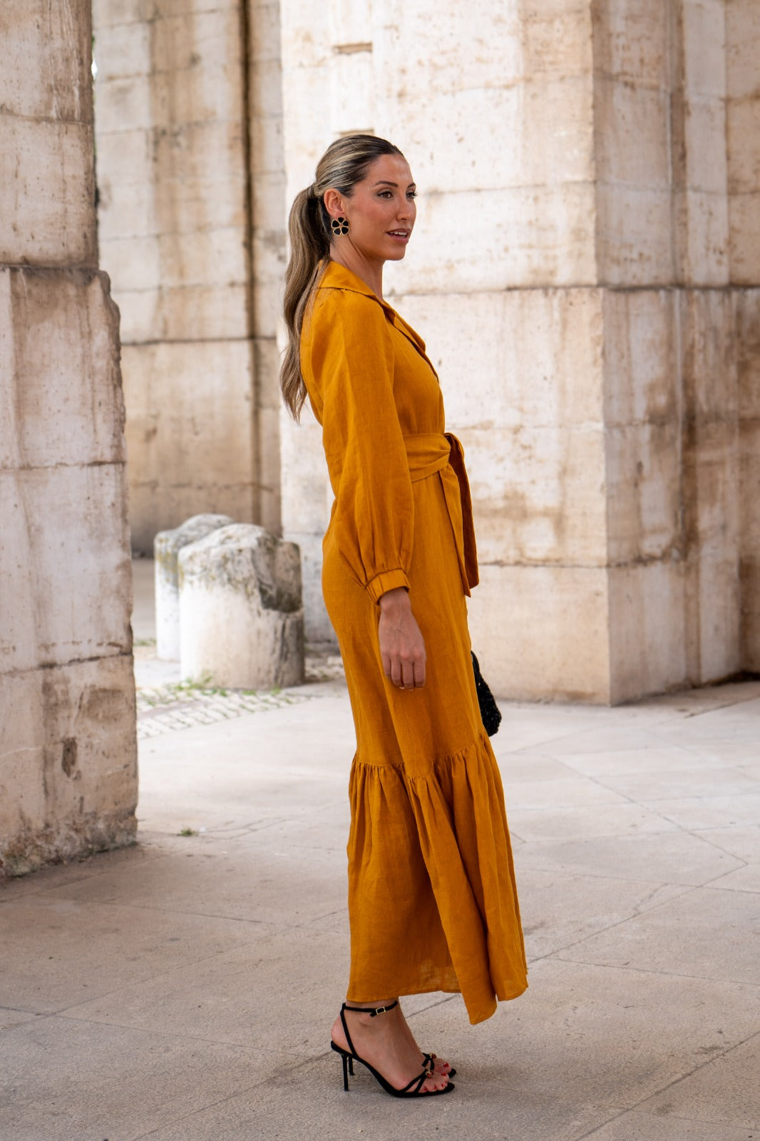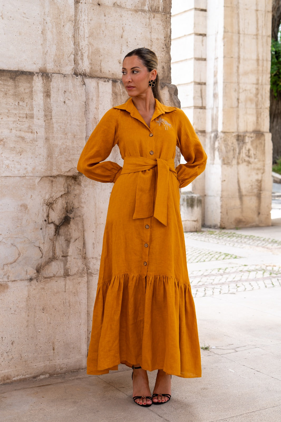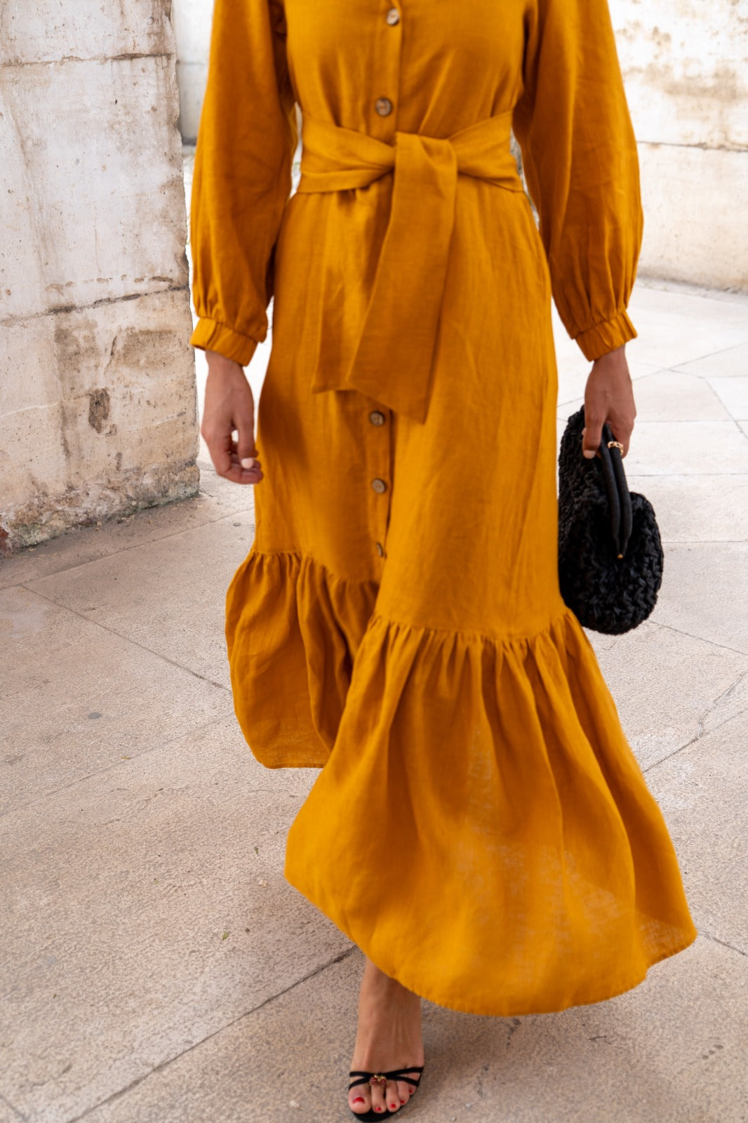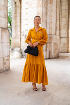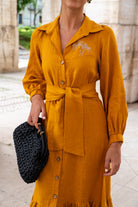 Vestido largo, abotonado entero, manga con puño, cinturón para anudar, volante abajo. En color mostaza.