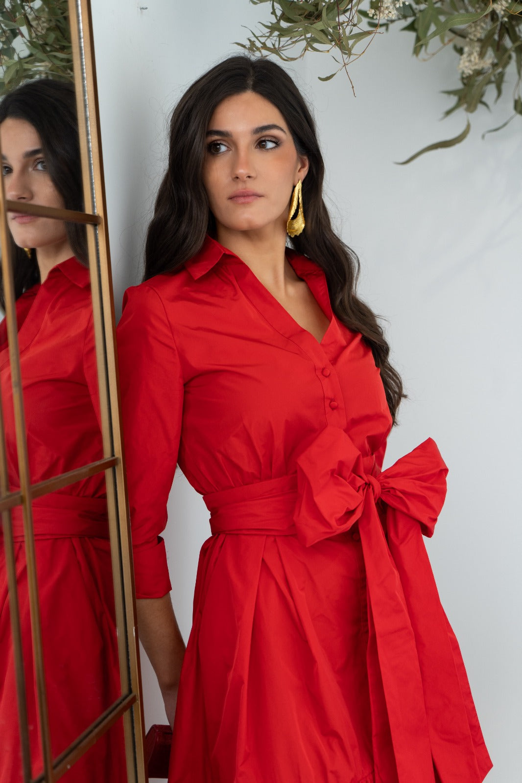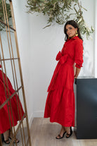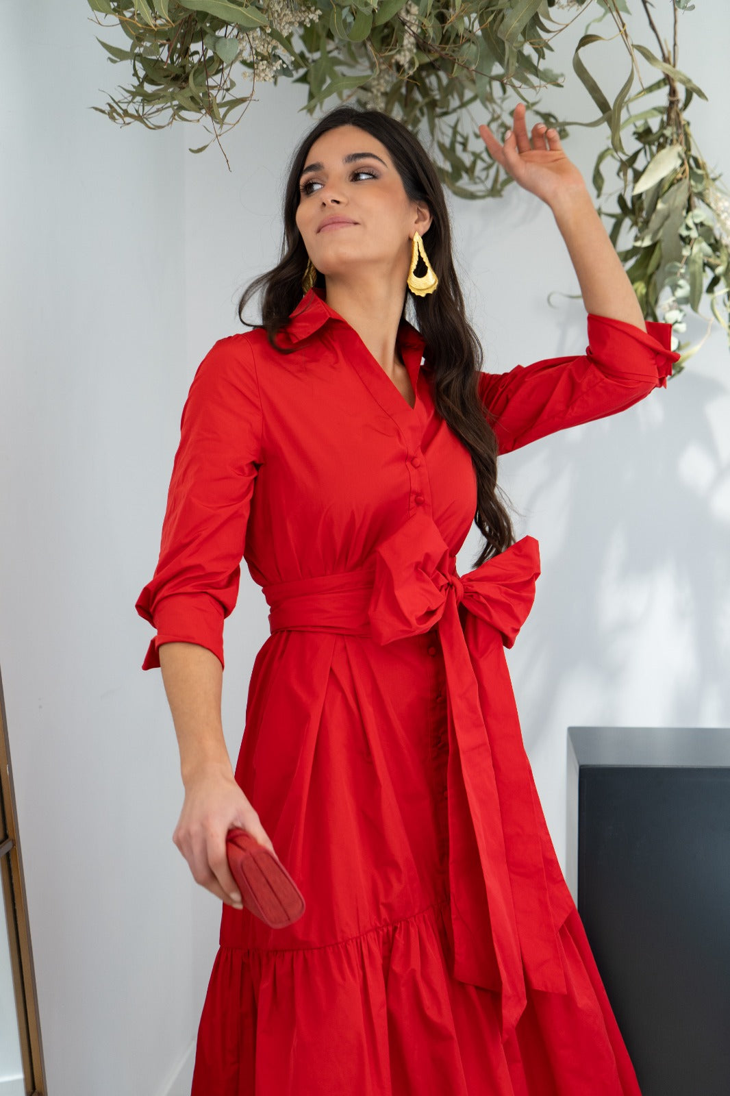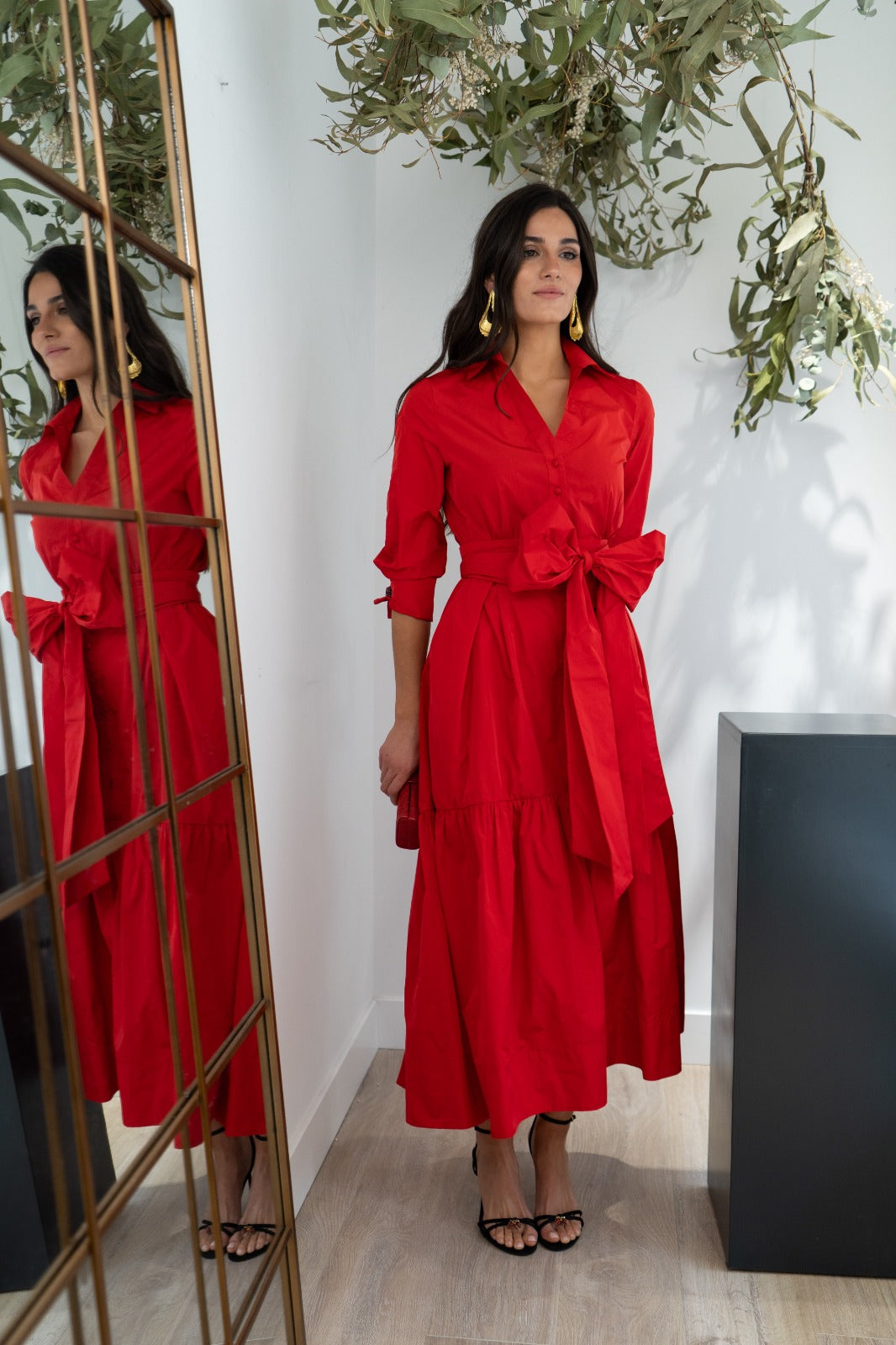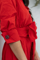 Vestido midi, escote camisero, manga francesa con puño, bolsillos laterales, abotonado, maxi lazo, falda evase. En color rojo.