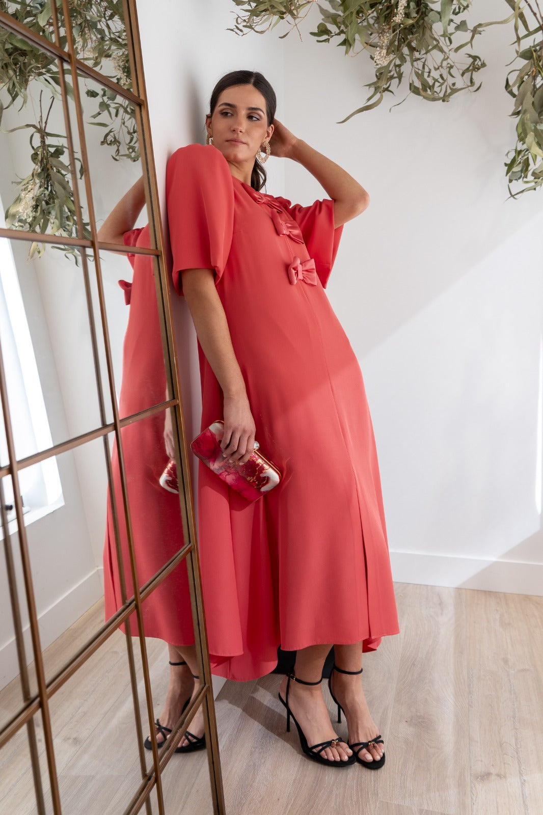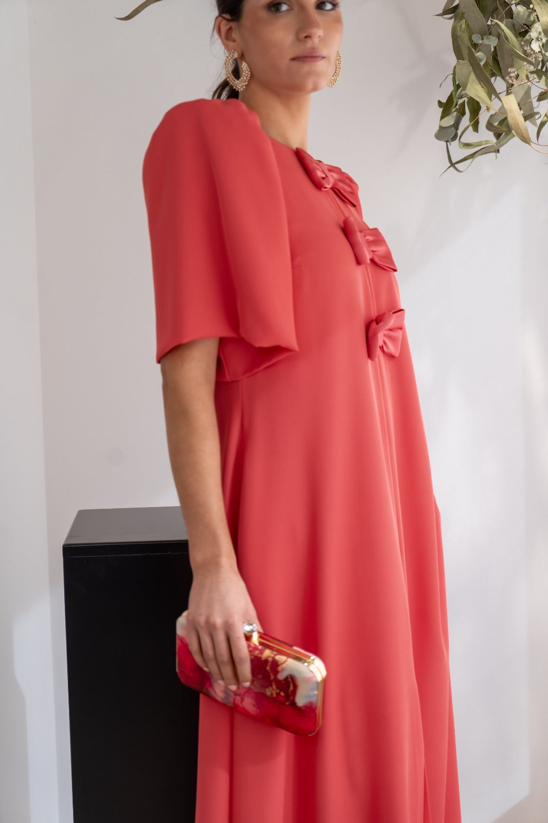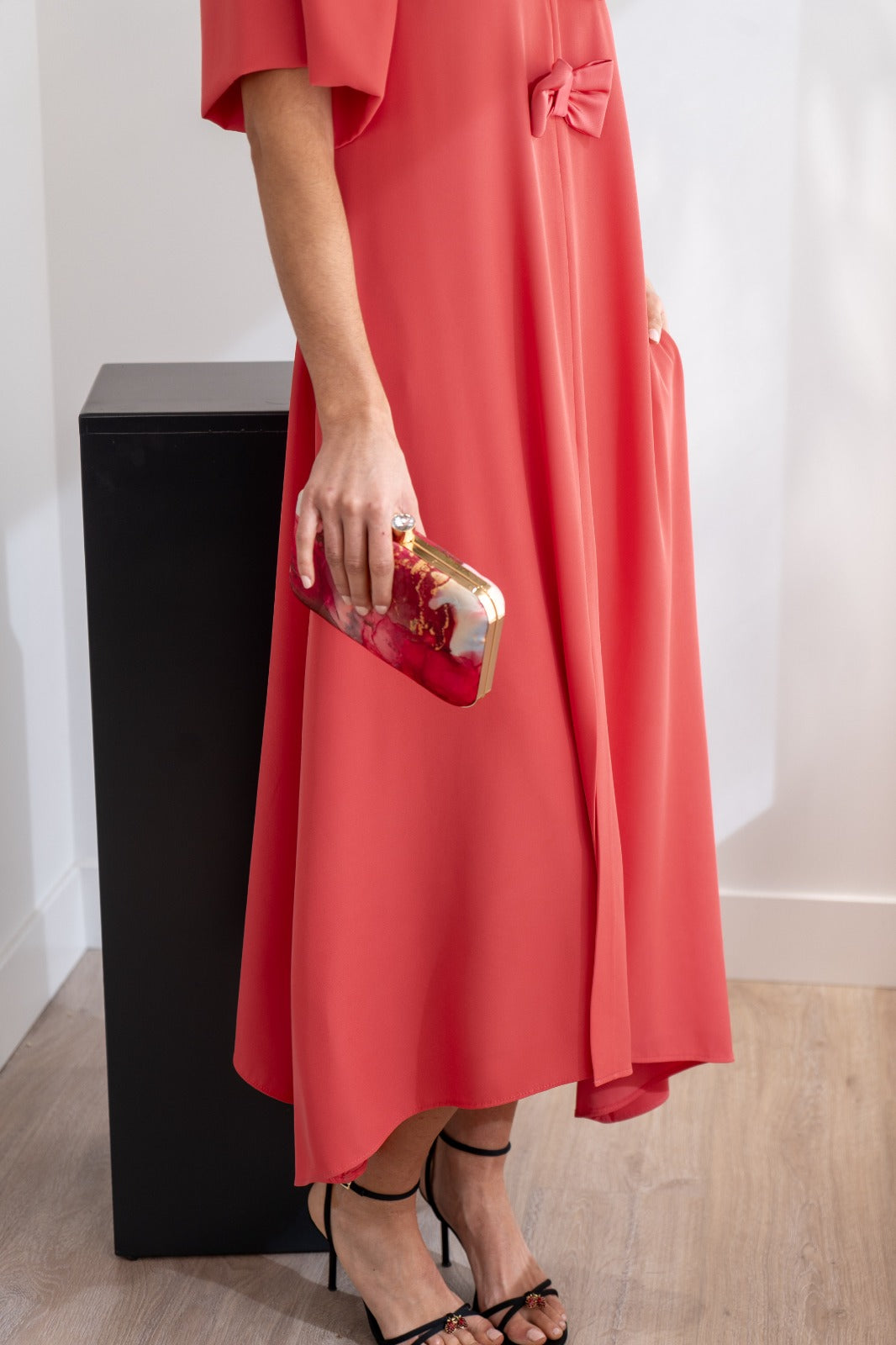 Vestido midi, escote redondo, manga corta ancha, oversize, detalle lazos delanteros, bolsillos, con forma a los lados, abertura delantera. En color coral.