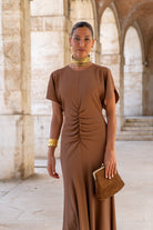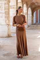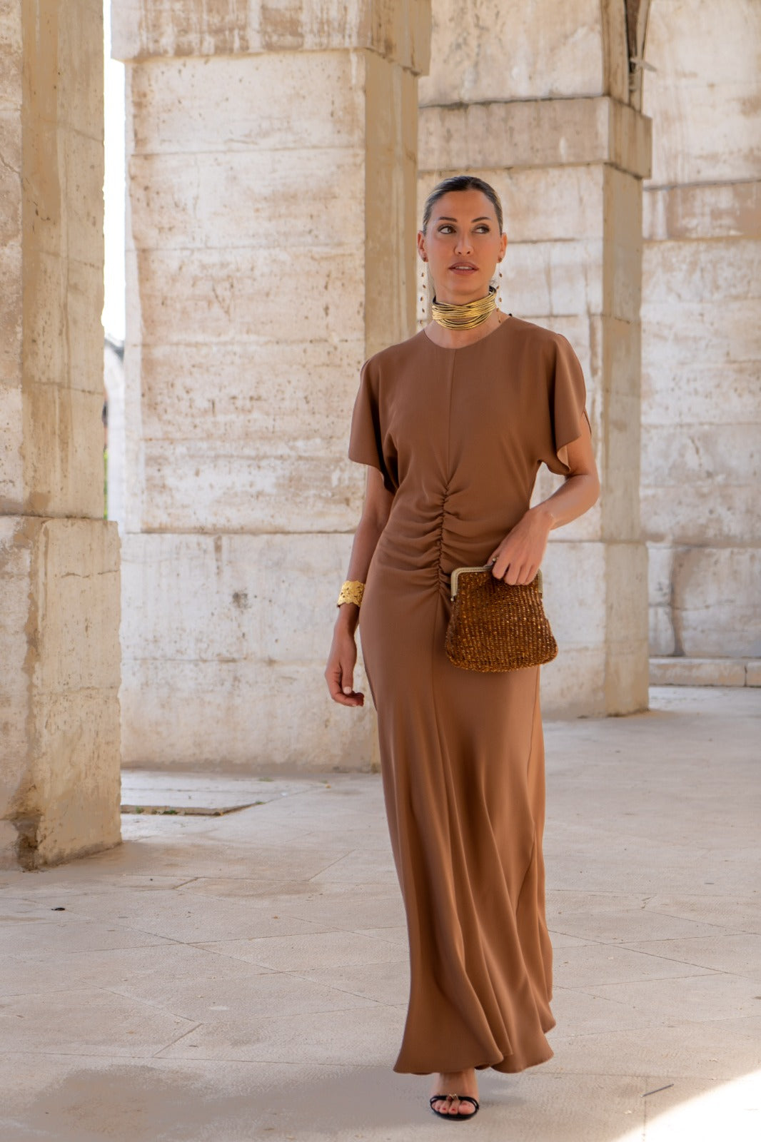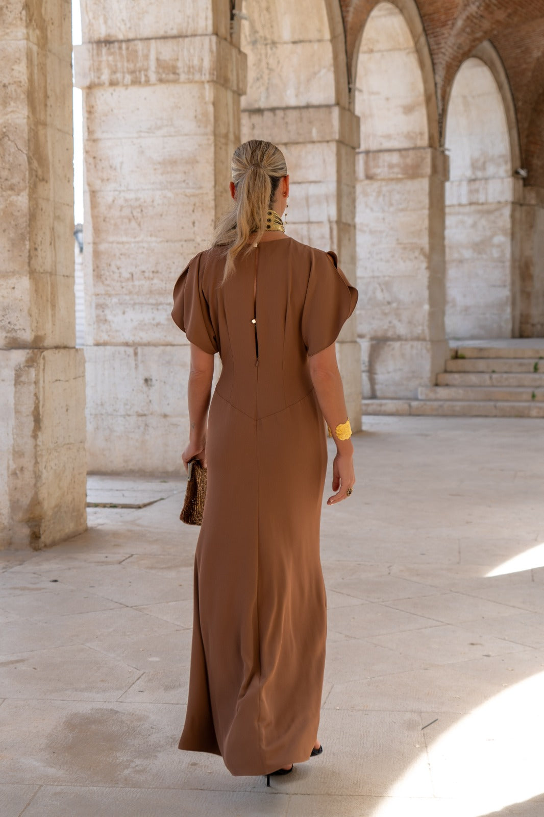 Vestido largo escote redondo, manga corta abierta, fruncido en cintura, vuelo abajo. En color marrón.