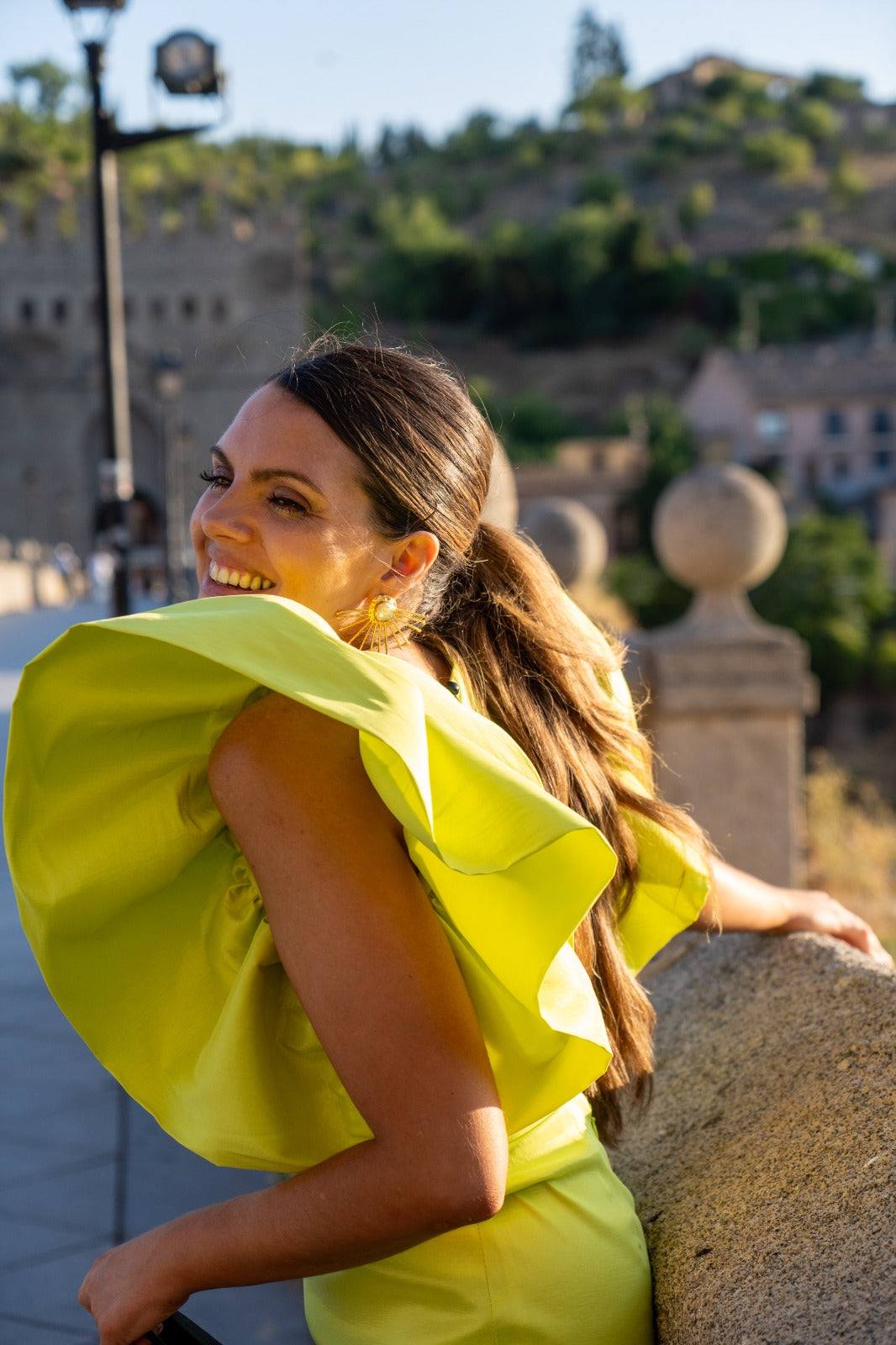 Vestido curto, decote redondo, costas abertas, sem mangas, com babados longos, corte na cintura. Em tafetá verde.