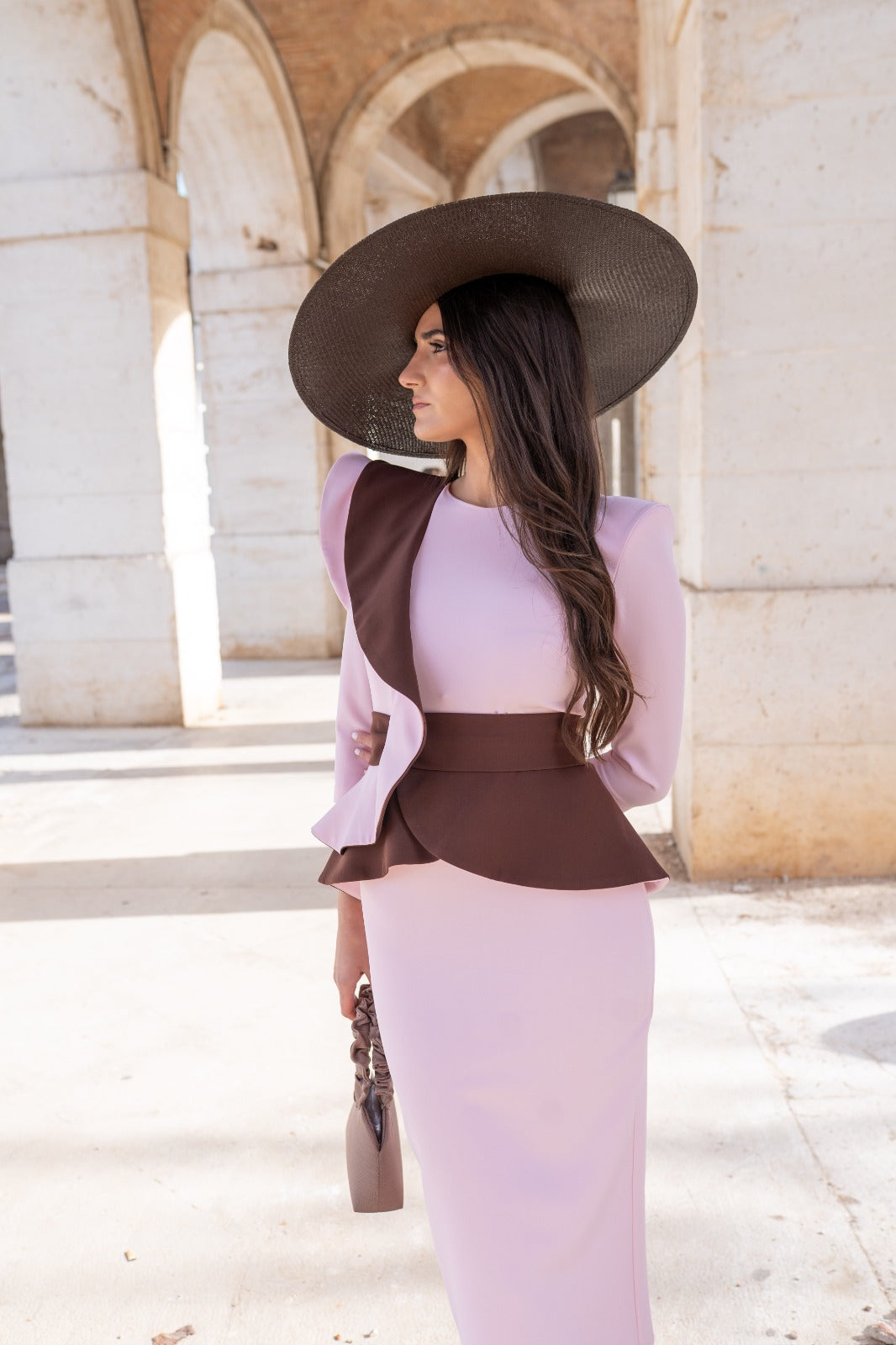 Vestido midi, escote redondo, manga francesa, volante en hombro y cintura, abertura trasera. Bicolor rosa y marrón.