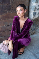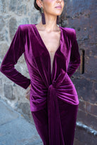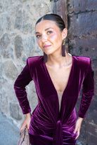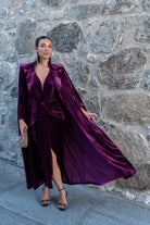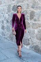 Vestido midi com decote em V em tecido transparente, manga comprida, nó na cintura e racha frontal. Em veludo bordeaux. Perfeito para combinar com a nossa capa ZAMIA.