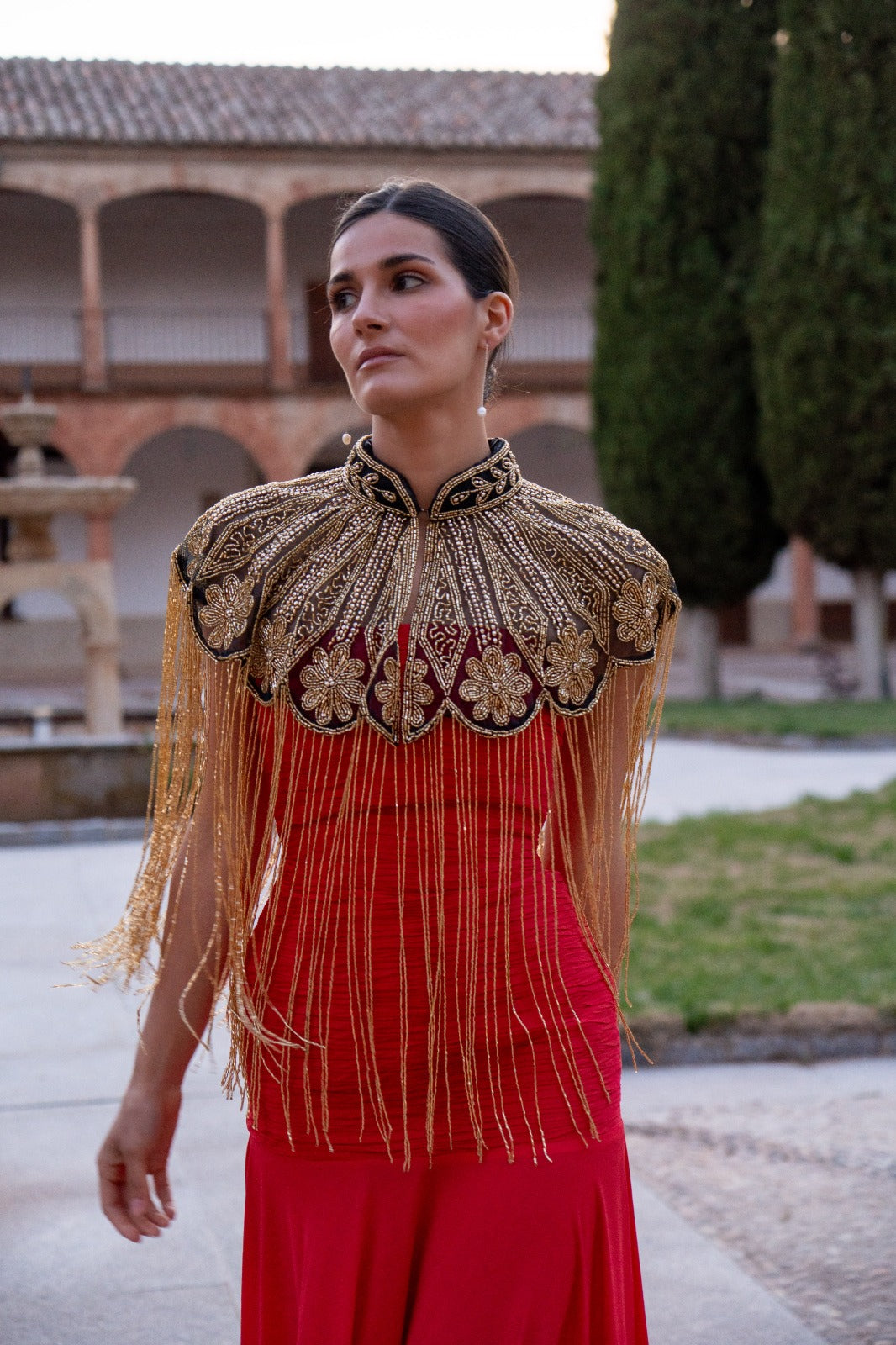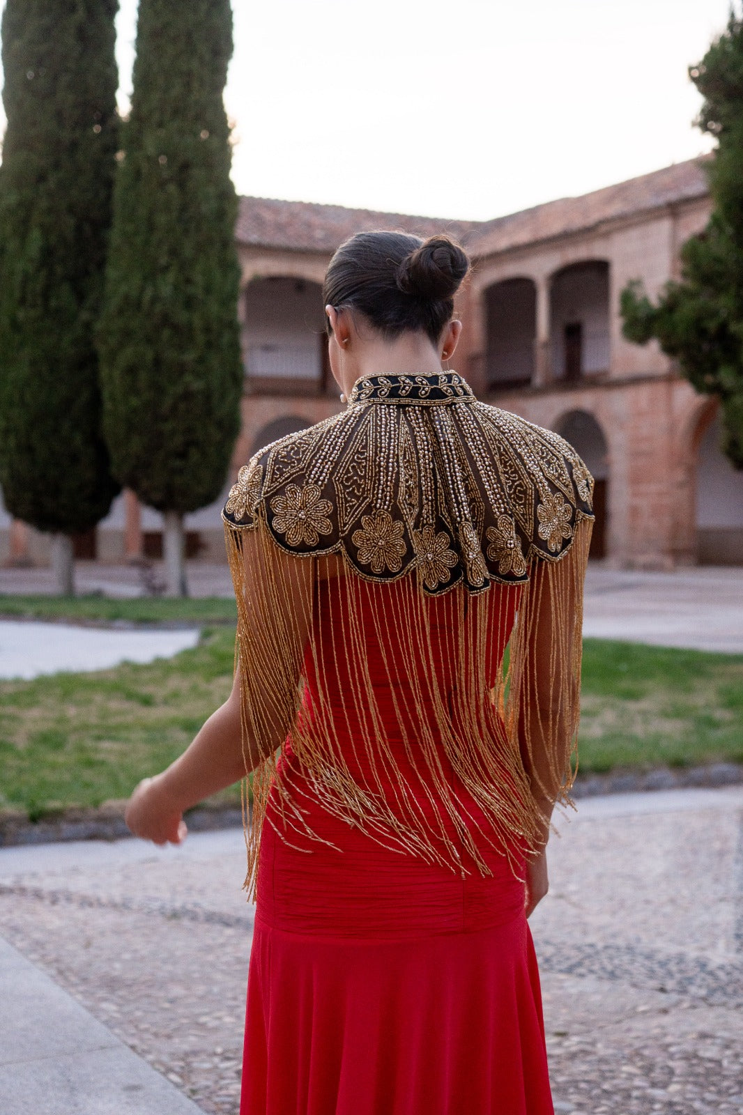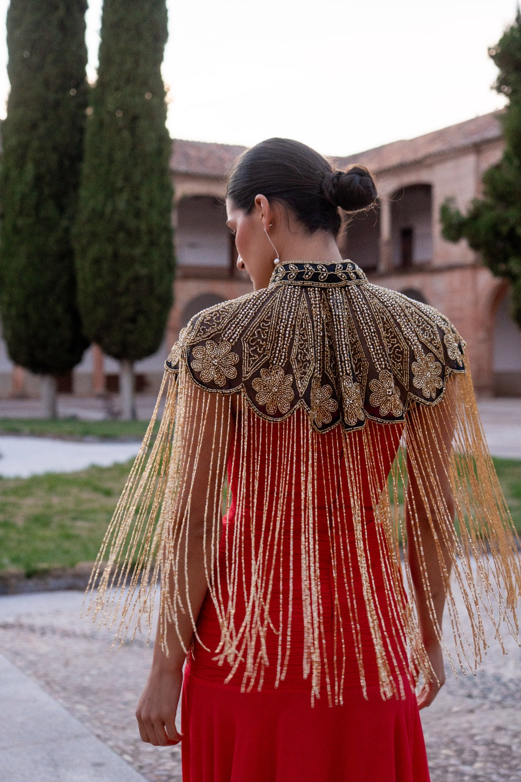 Capa curta, que abraça o pescoço e cai em forma de leque com linhas delicadas e detalhes que lembram flores e motivos clássicos. Em preto e dourado.