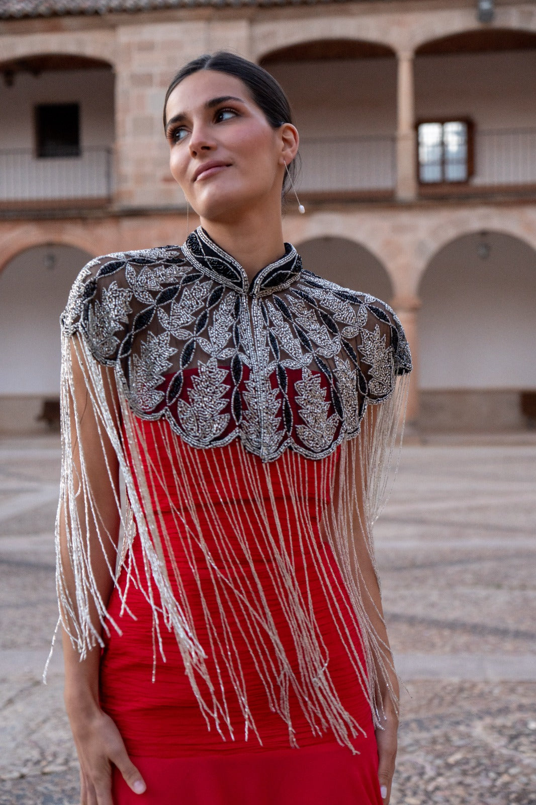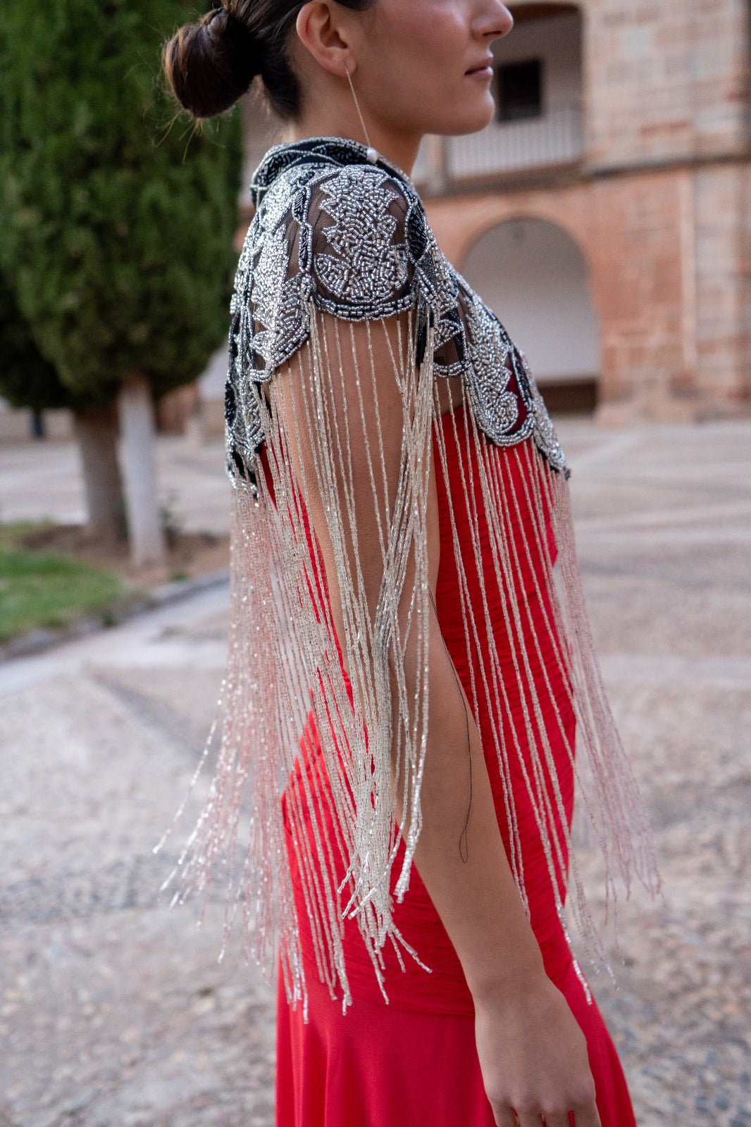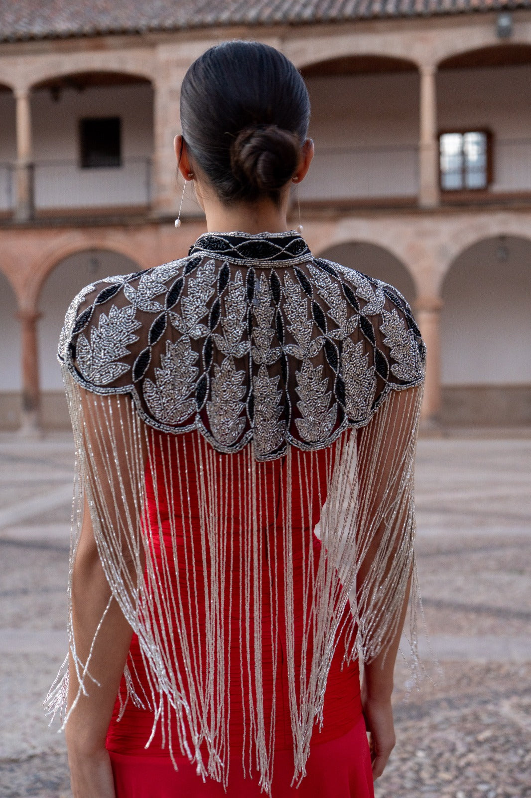 Capa curta, com a delicadeza de um leque de franjas finas e bordados artesanais. Em preto e prateado.