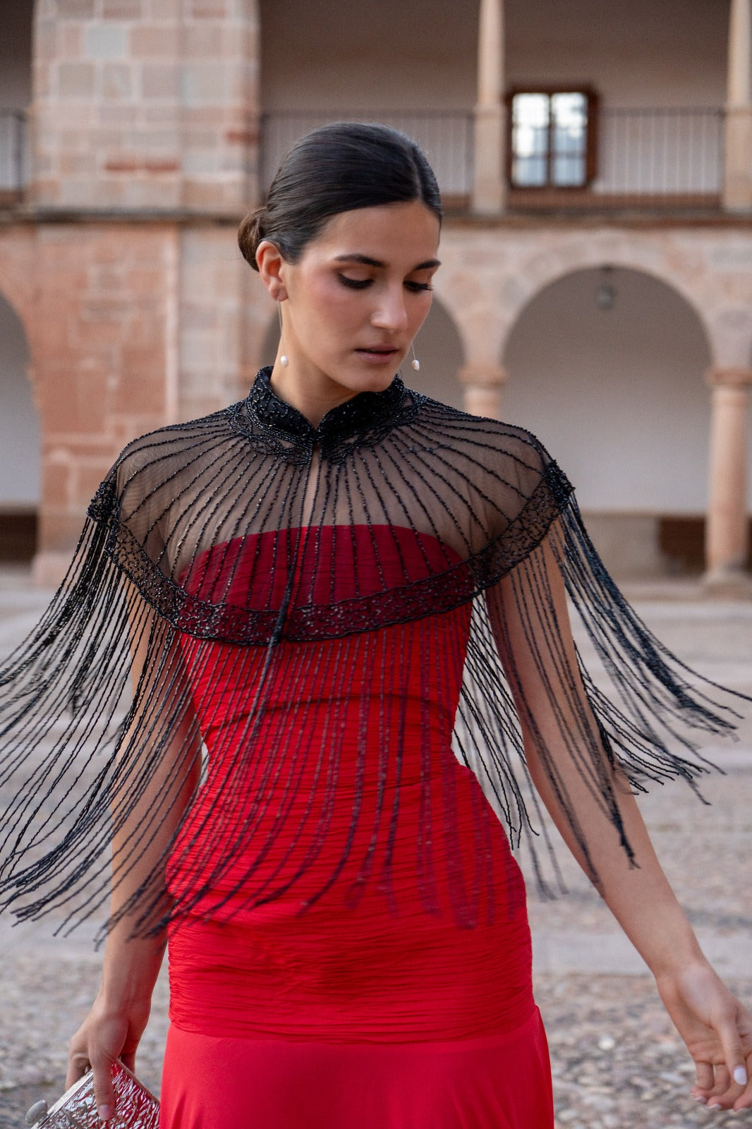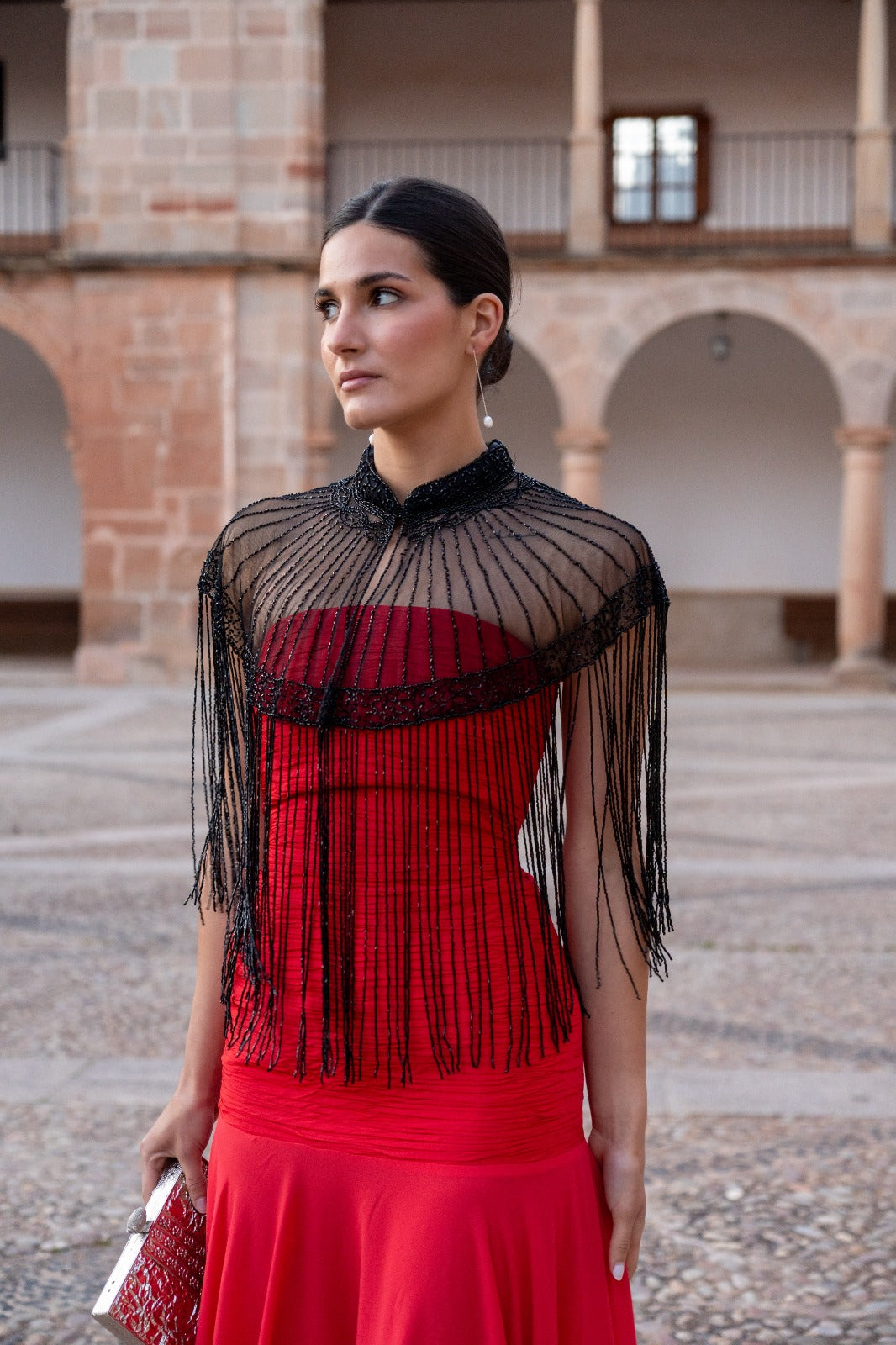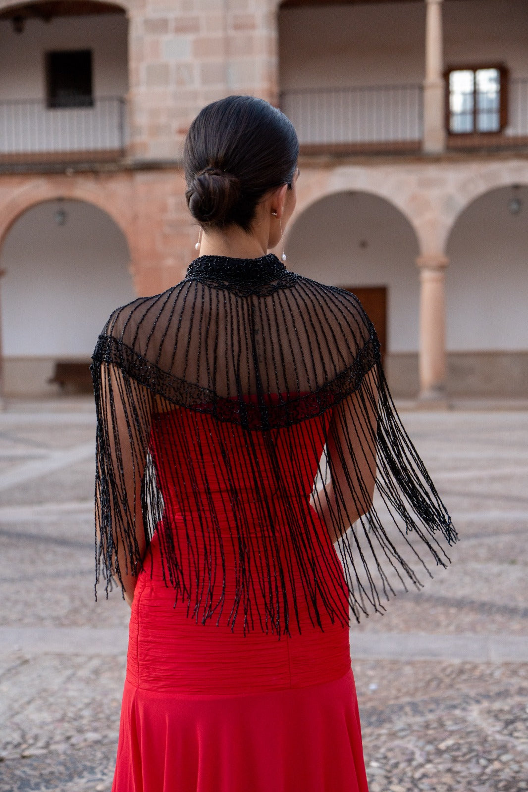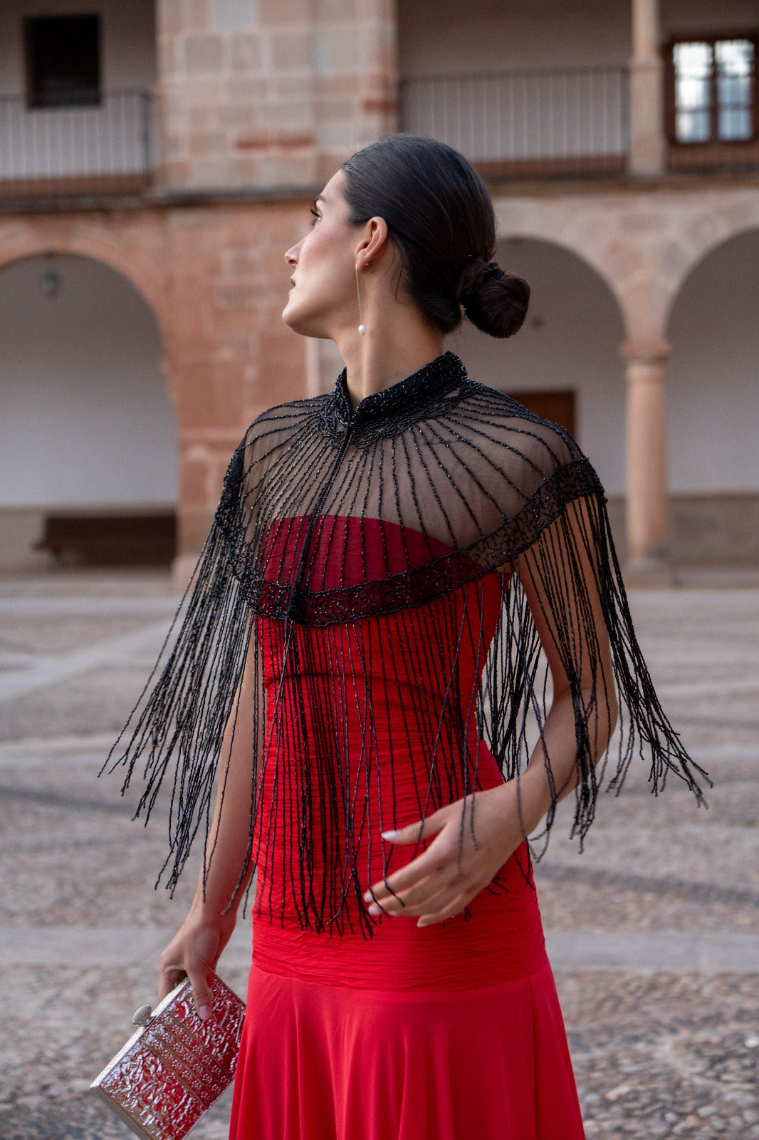 Capa curta, com franjas em pedraria preta, com um remate decorativo na parte inferior que acrescenta um toque final.