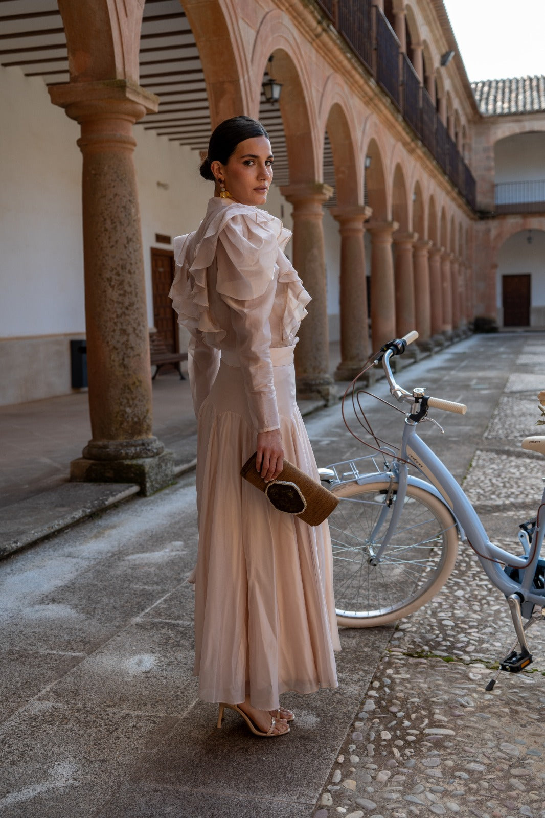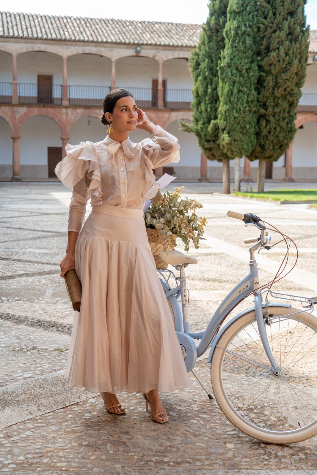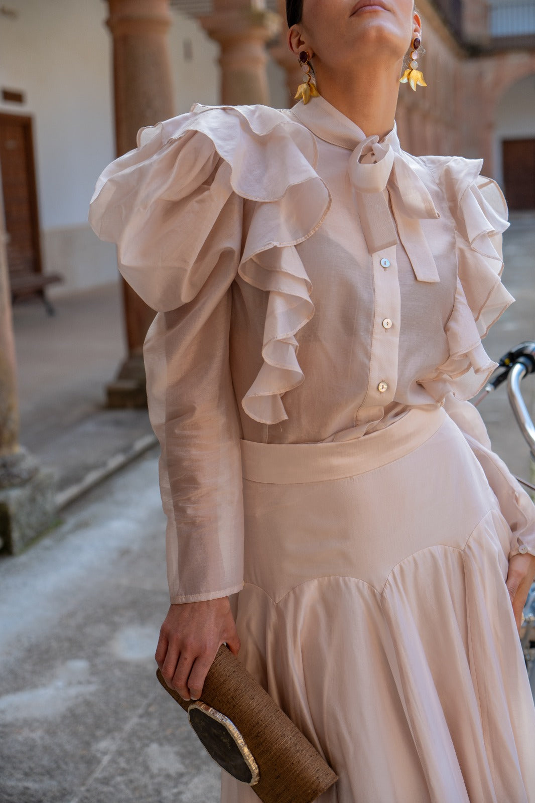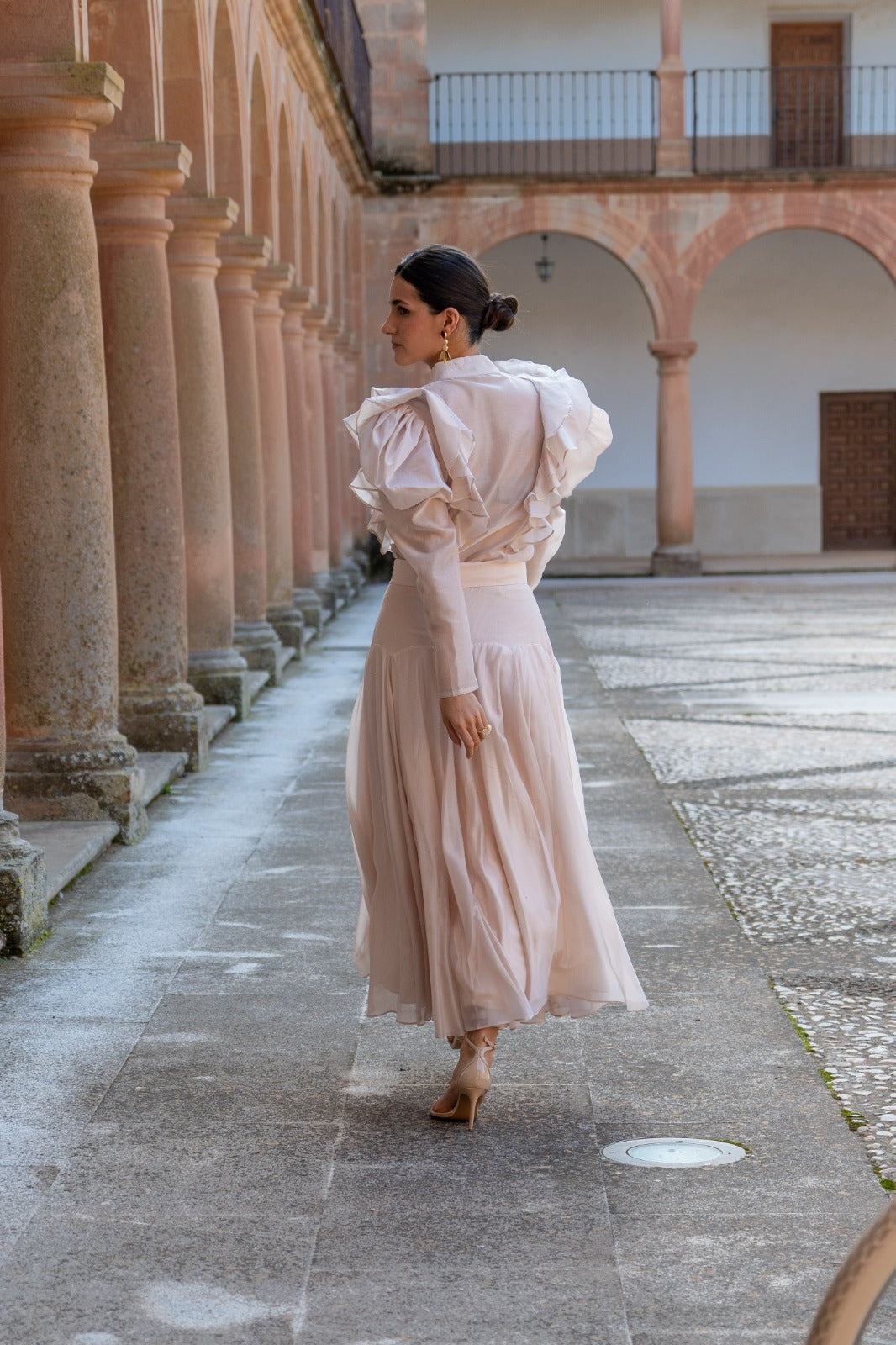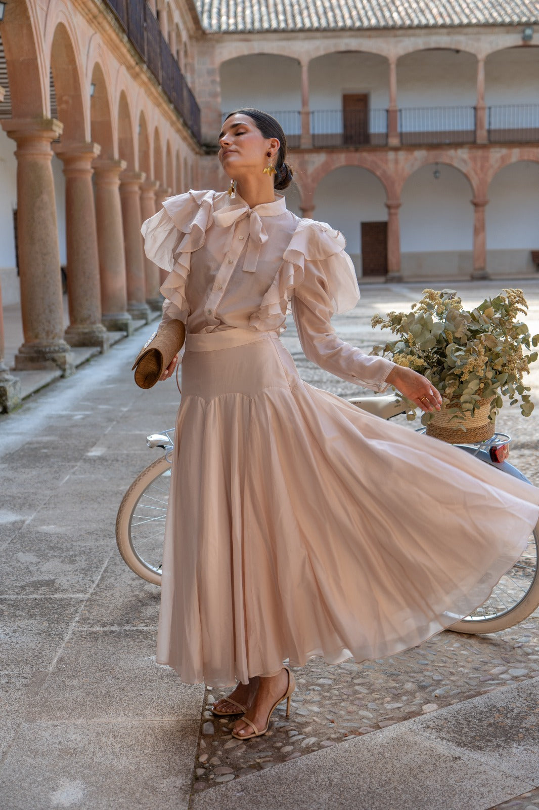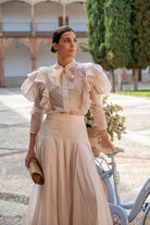 Conjunto composto por blusa com folhos em cascata na parte da frente, gola com laçada, manga comprida com punho e saia com cintura alta ajustada que realça a silhueta e uma saia ampla e fluida. Em cor rosa nude.