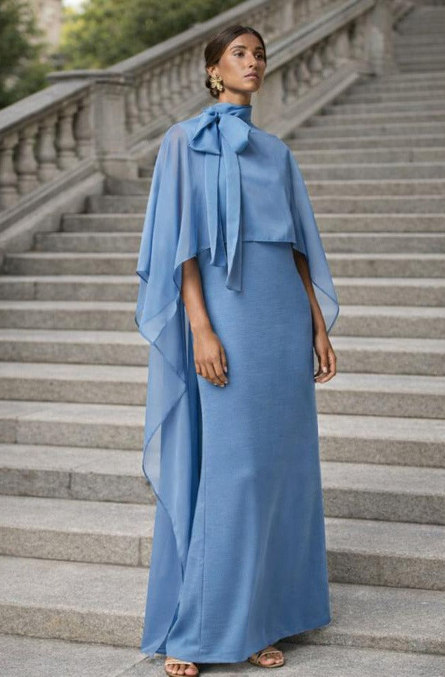 Vestido comprido, decote redondo sem mangas, abertura nas costas, capa em chiffon com laço, amovível. Em azul.