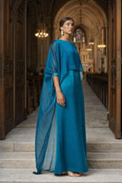 Vestido comprido, decote redondo sem mangas, abertura traseira, capa em gaze, que se tira e põe. Em azul-petróleo.